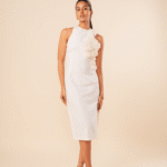 - An ivory calf length dress made in an Organic cotton linen. An empire line bodice with flowers cascading on the side ruched in peace silk organza. The dress has a mid thigh length slit on both the sides , finished with a metallic zipper on the back.